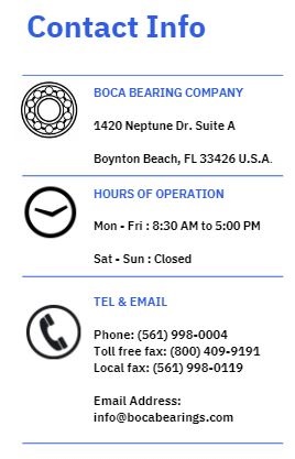 The Boca Bearing Company stands behind the quality of our product 100% and pride ourselves in delivering top notch customer service. If you have any questions, concerns or problems please reach out to us right away. We are available by email, chat support and a toll free or local number during regular business hours, Monday through Friday. We look forward to hearing from you!