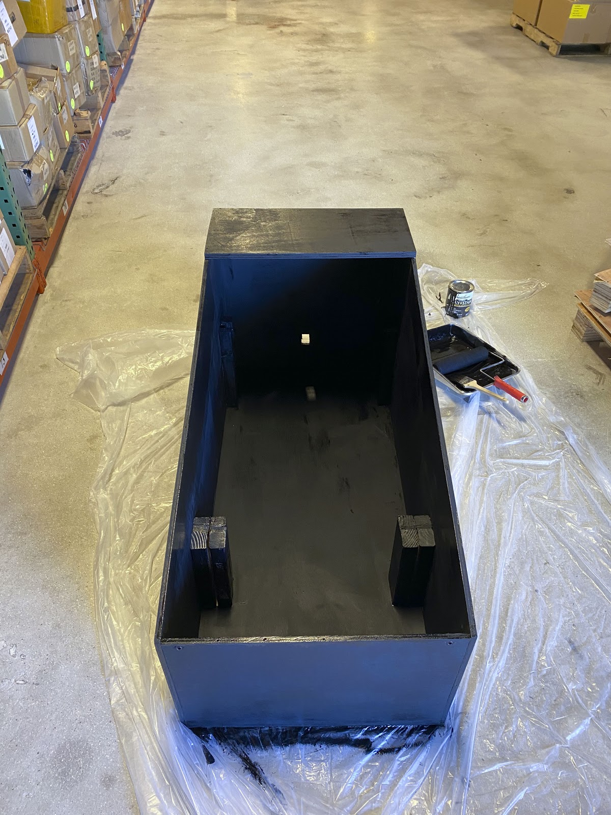 After the box finished drying the next step was to put the metal trim, and handles on it. There were a couple reasons to do this versus leaving it as it was. First the trim is used to hold in the future lid of the pinball machine so no balls go flying back out during game play, and the second reason is that the metal on the corners will help mitigate damage from the inevitable wear and tear on the corners in moving. The handles were added for a similar reason, damage mitigation, while the box is plenty movable on its own the handles help mitigate the risk of someone dropping it by giving an adequate hand hold.